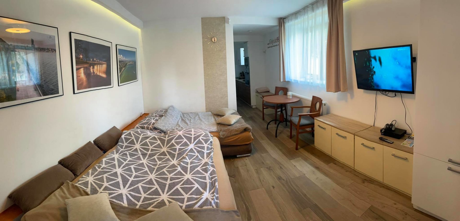 Niemalże za oknem place zabaw, sklepy, market, wypożyczalnia rowerów. Wygodne sofy, rozkładane automatycznie, zapewniają komfort, dzięki sprężynom kieszeniowym i dużej powierzchni 200x140 centymetrów. Telewizor 40-calowy posiada szereg polskich kanałów, WiFi.